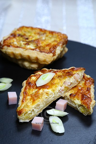- يقدم كيش البصل الأخضر والديك الرومي المدخن دافئا.