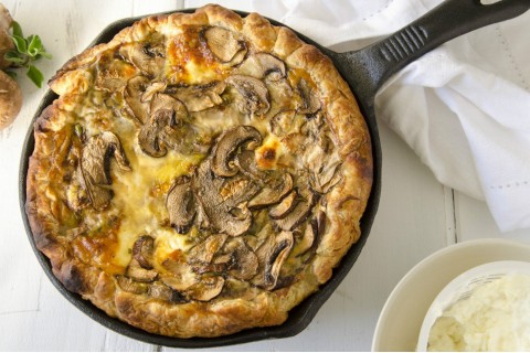 - والآن وبعد أن قمنا بتقلية جوانح البصل والفطر وبعد أن تركناها لتبرد قليلاً، نقوم بتوزيع مزيج البصل والفطر في صينية العجينة بالتساوي، ثم نقوم بسكب مزيج البيض والحليب الذي قمنا بتحضيره مسبقاً فوق مزيج الفطر والبصل، ونختم هذه العملية برشة من الملح والفلفل الأ