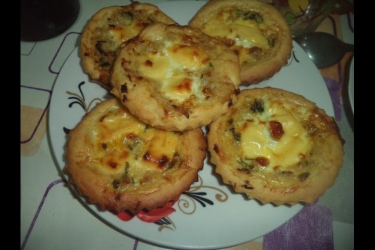 2. نخض العلبة جيداً لتندمج المكونات وتتشكل عجينة سهلة توضع لترتاح 15 دقيقة تم نشكل كرات صغيرة نشكلها في القوالب الفردية وتثقب بالشوكة ويوضع البصل بعد قليه مع الملح والفلفل والبقدونس.