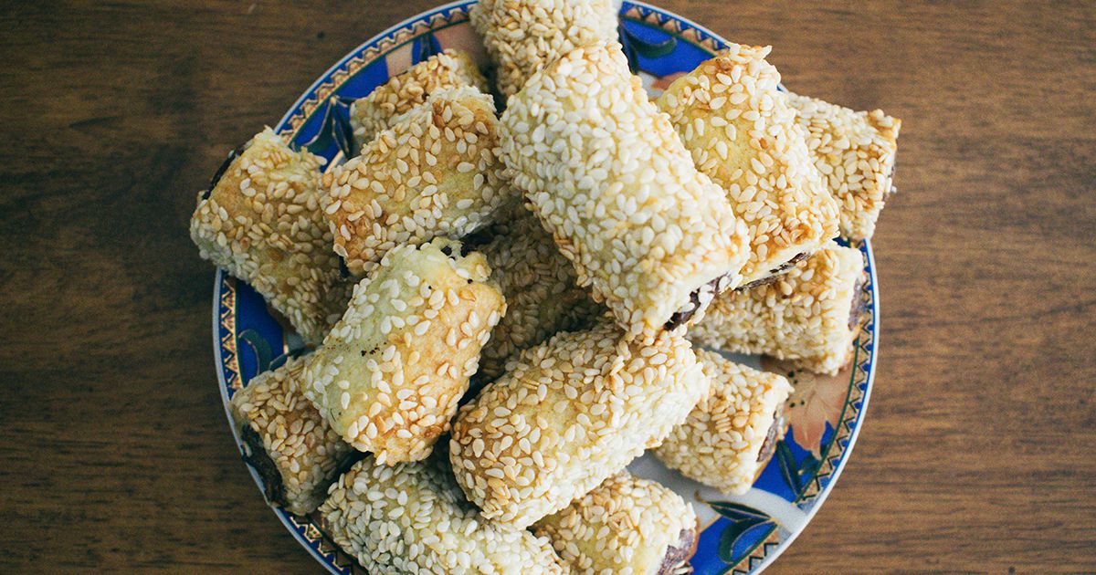 9- قطعي الأصابع بالحجم الذي ترغبين، غمسي قطع الكليجة بالسمسم وضعيها في صينية فرن.