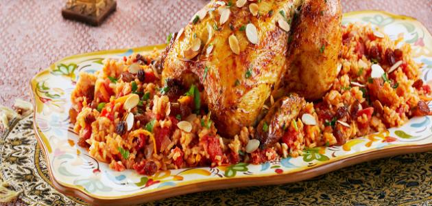 - وزّعي الأرز في طبق التقديم وزيّنيه باللوز المحمص ثمّ ضعي قطع الدجاج.