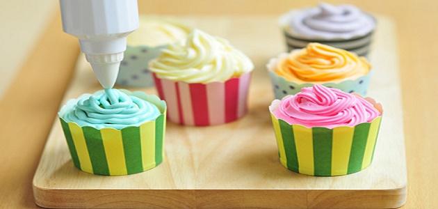 - وضع الكريمة في كيس الحلواني وحفظها في الثلاجة لتبرد ويسهل العمل بها، ثمّ تزيين الكب كيك، ويمكنك كذلك إضافة ملون طعام باللون المفضل لديك.