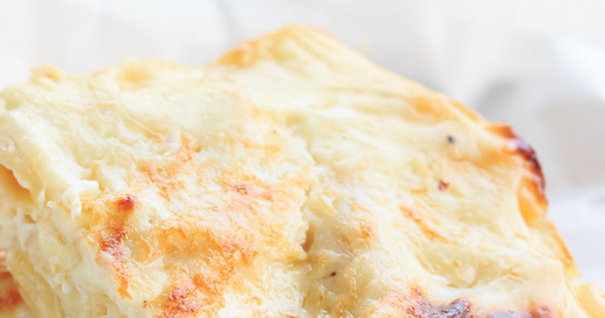 8- أسكبي نصف كمية المعكرونة في صينية فرن ثم وزعي مزيج اللحم. أضيفي كمية المعكرونة المتبقية ثم أسكبي صلصة البشاميل.