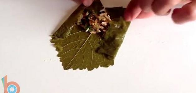 • يفرد ورق العنب بحيث يكون السطح الخشن للورقة باتجاه الأعلى.