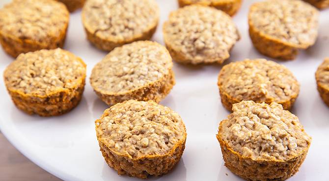 ترش صينية الكابكيك الصغير برذاذ الخبز، يصب خليط الشوفان فيها، ويخبز لمدة 10 دقائق حتى يصبح الوجه ذهبياً ومقرمشاً.