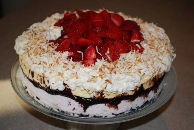 5. ثم توضع الطبقة الثانية ونعيد الكيكة إلى الفريزر، وبعد أن تتماسك جيدا تغطى الدائرة الثانية بنوع آخر من الآيس كريم غير الطبقة الأولى وتغطى بالطبقة الأخيرة.