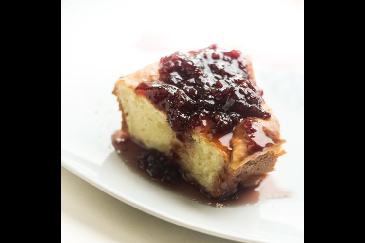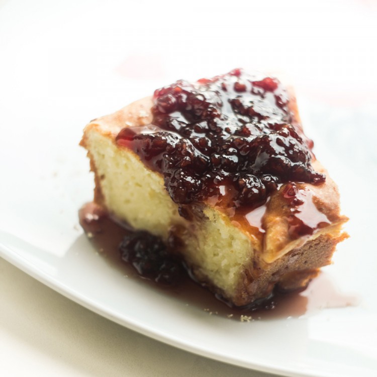 9. اتركي الكيك ليبرد ثم قبل التقديم زيني بالقليل من مربى التوت الأرزق وقطعيه.