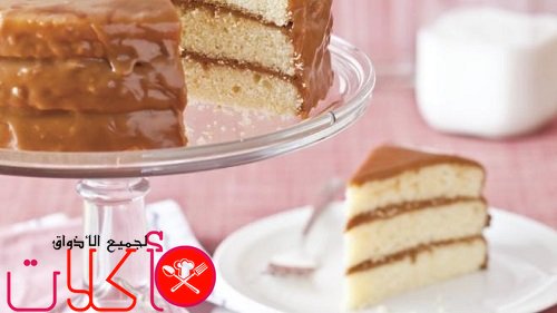 ضعي طبقة الكيك في صحن بعرض 3 انش، مدهون أو مفروش بورق الزبدة، شذبي أسفلها وضعي فوقها كوباً من الكراميل وافرشيه بالتساوي، ثم ضعي طبقة الكيك الثانية وغطي الوجه والحواف بما تبقى من الكراميل