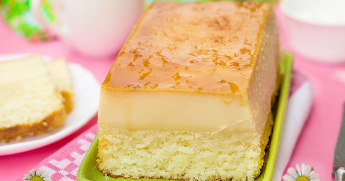 6- أسكبي خليط الكيك فوق طبقة الكاسترد. أدخلي القالب إلى الفرن المحمّي مسبقاً على حرارة 180 درجة مئوية لـ20 دقيقة حتى ينضج الكيك.