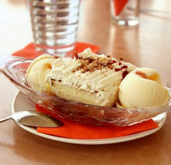 6. يترك “الآيس كريم” حتى يصبح طريّاً قليلاً. توضع شريحة من الكيك فوق ورق الزبدة لتغطي قاع القالب، ويفرد عليها “الآيس كريم” بنكهة الشوكولاتة أو البندق. توضع فوقها الشريحة الأخرى من الكعكة، ثم يضاف اليها “الآيس كريم” بنكهة الفانيليا أو الكراميل.