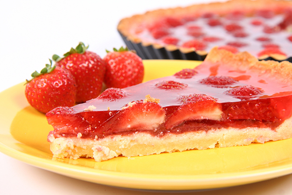 5. نصب الجيلو فوق صينية الكيك المشوي بشكل تدريجي ثم نضيف شرائح الفراولة ونضعها في الثلاجة إلى أن تبرد تماماً.