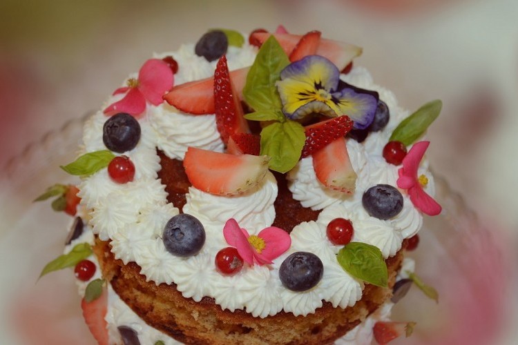 7. طريقة التقديم: يُقدَّم كيك الريحان والتوت، دافئًا، أو في درجة حرارة الغرفة. ويُزيَّن بالكريما المخفوقة، والمزيد التوت والفراولة، وأوراق الريحان الطازجة.
