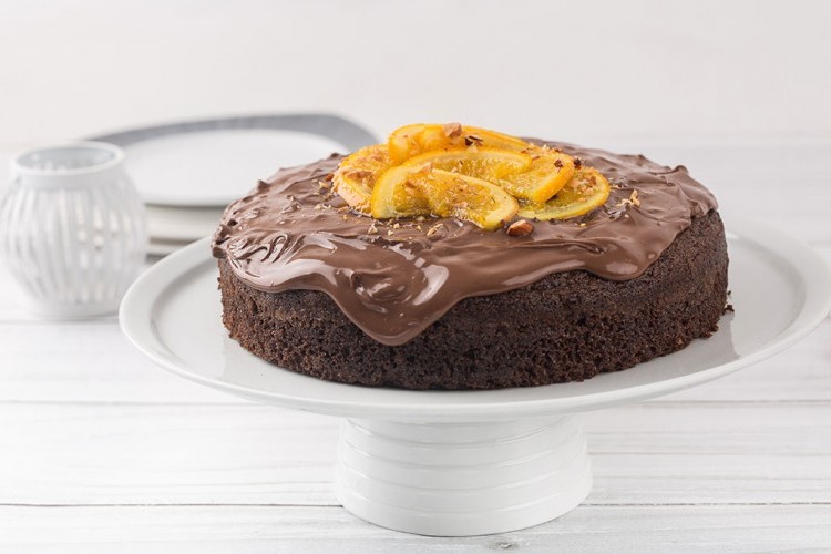 7. طريقة التقديم: يُخرج القالب من الفرن، ويُترك ليبرد. ثم تُضاف كريمة الشوكولاتة المُعدَّة مسبقًا إليه. ويُزيَّن القالب بشرائح البرتقال.