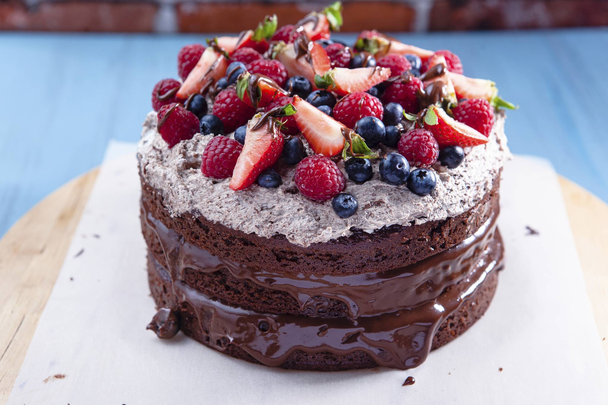 يغلف الكيك بالكريمة المبردة ويزين بتوت العليق الأزرق والفريز والتوت البري الأحمر.
