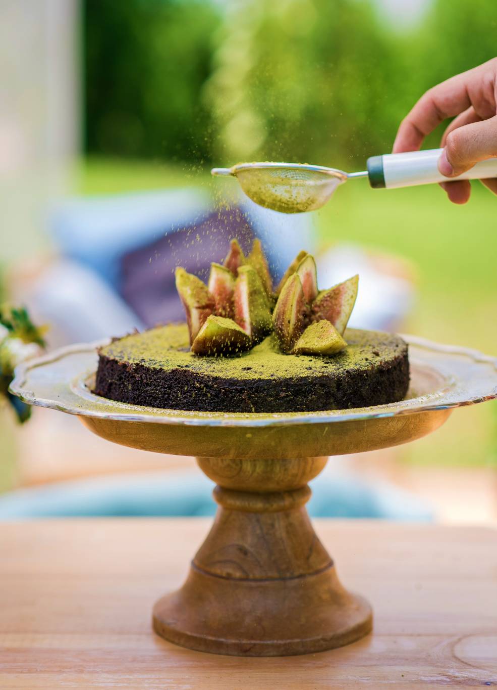 يزين بالتين الطازج أو الفراولة أو أي فاكهة موسمية و يرش باستخدام منخل بودرة شاي الماتشا الأخضر
