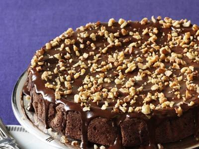- بعد أن تخرج من الفرن نتركها ترتاح ثم تقلب علي رف سلك ونتركها لتبرد تماما ثم نصب عليها ما تبقي من الشيكولاتة الذائبة وتزين بالبندق المجروش وتقدم .