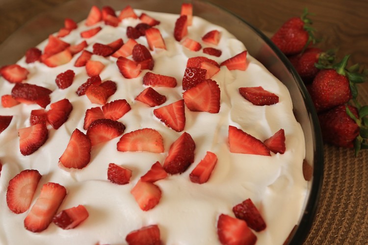 9. أخرجي الكيك من الثلاجة وغطي وجه الكيك بالكريمة المخفوقة وزيني بحبات الفراولة المقطعة.