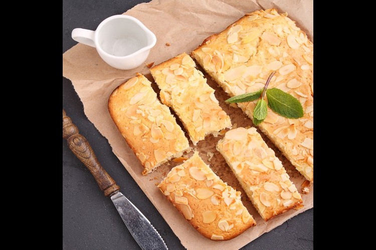8. صبي المزيج في القالب المجهز ووزعي اللوز على الوجه.