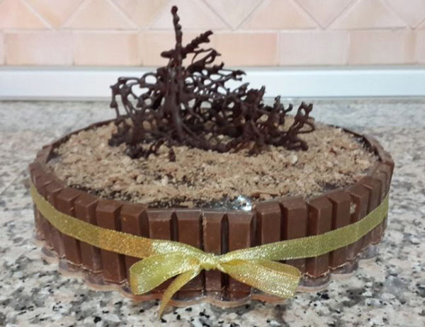 8. قبل التقديم ينزع قالب التشيز كيك و يزين أطراف الكيكة بأصابع الكت كات.