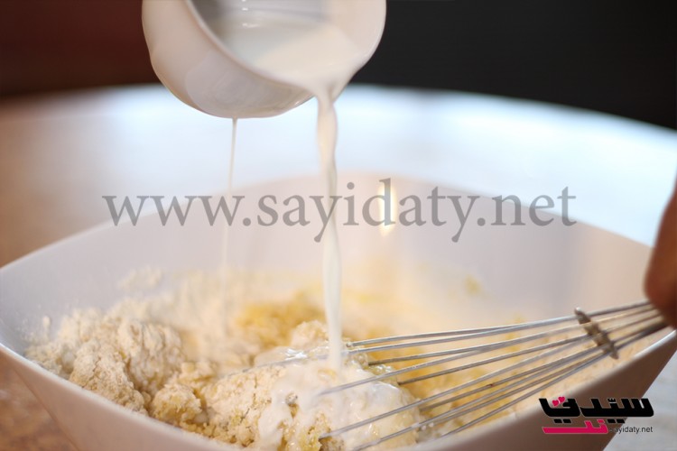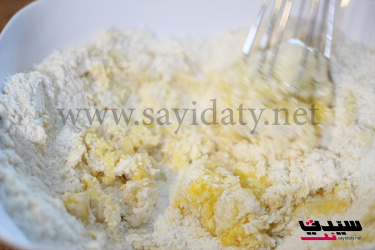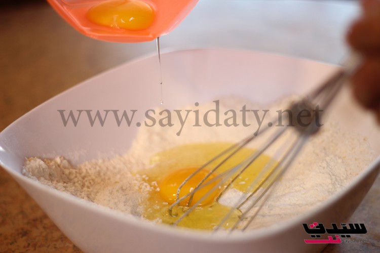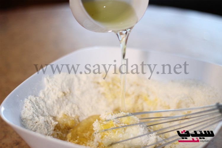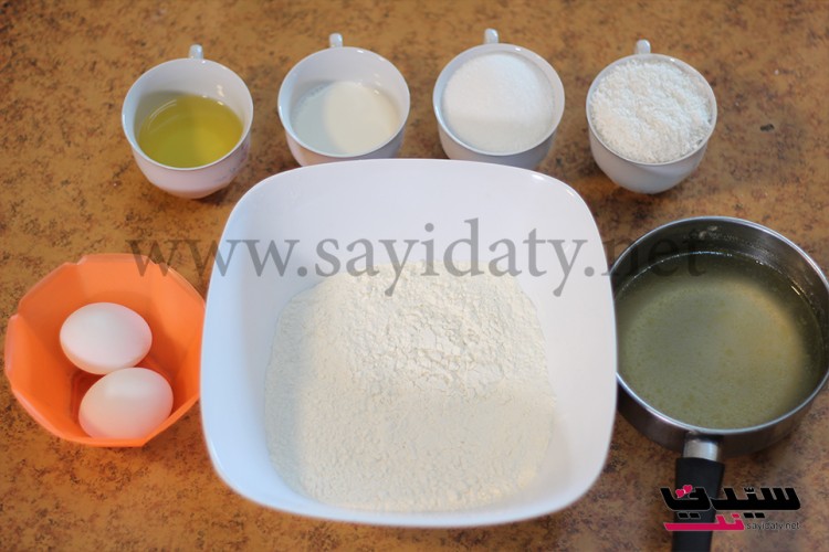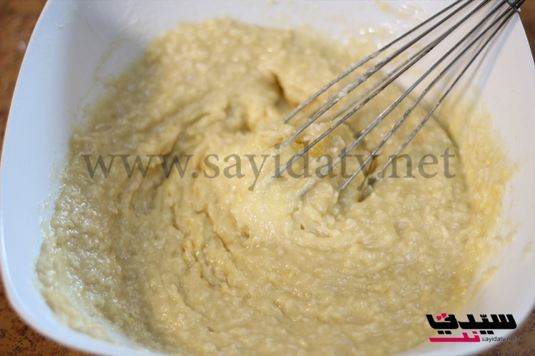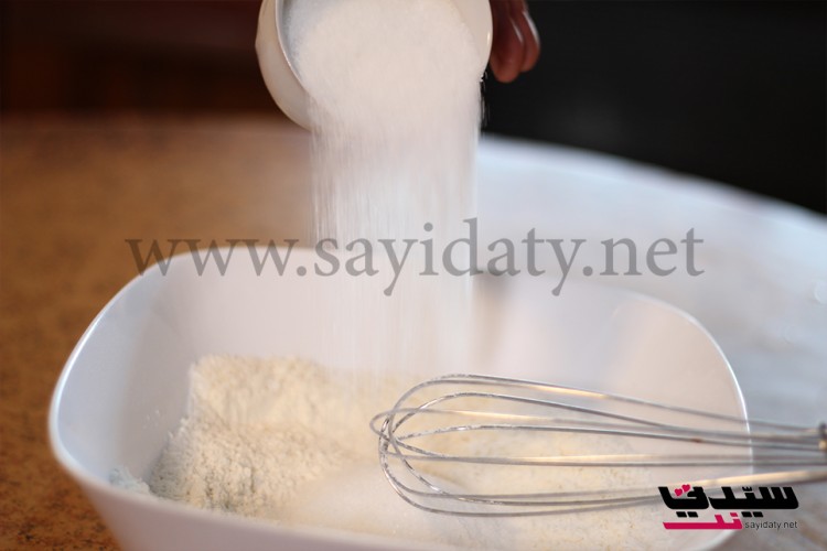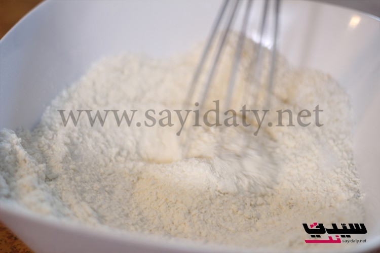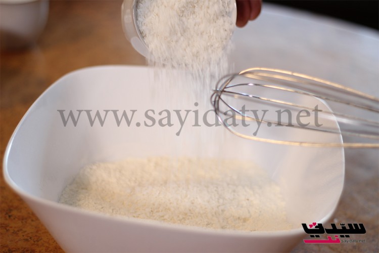 نخلط الطحين مع البيكنج باودر والفانيلا والملح ثم نضيف جوز الهند