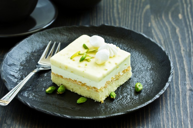 10. زيني الكيك بالكريمة والفستق الحلبي وضعي الكيك في الثلاجة لمدة ساعة على الأقل قبل التقطيع والتقديم.