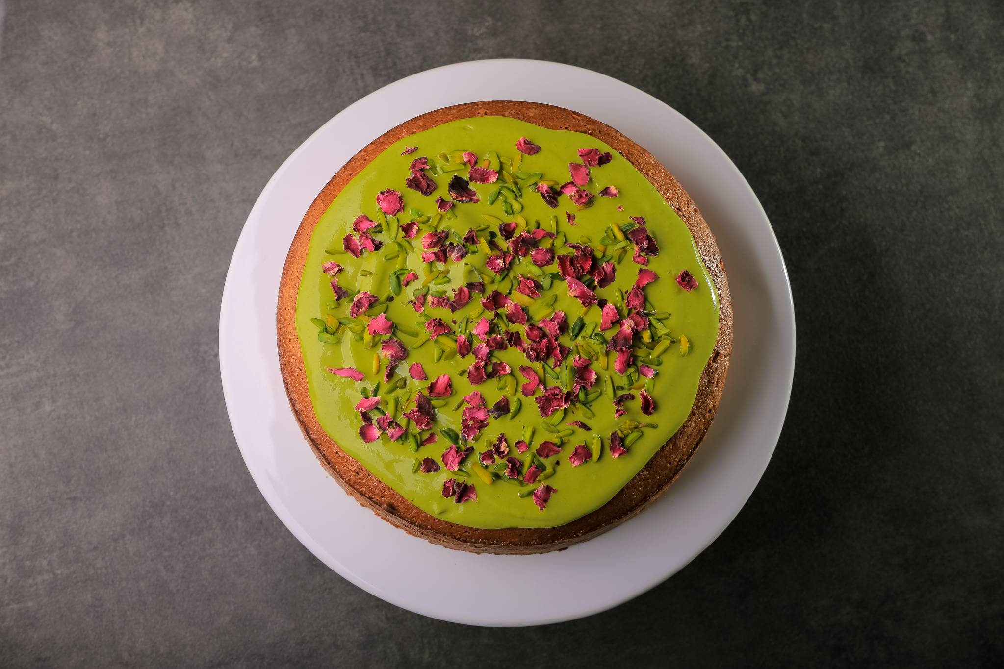 يضاف معجون الفستق الحلبي والملح وماء الزهر وماء الورد ويخلط جيداً حتى يصبح اللون أخضر فاتح.
