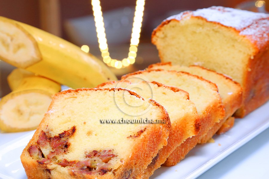 - في قالب كيك ملبس بورق المطبخ، يسكب العجين ويزين بدوائر الموز المعسلة.
