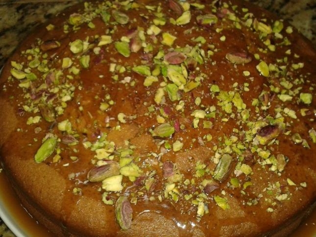 7. نسكب التوفي فوق الكيكة وترش بالفستق الحلبي.