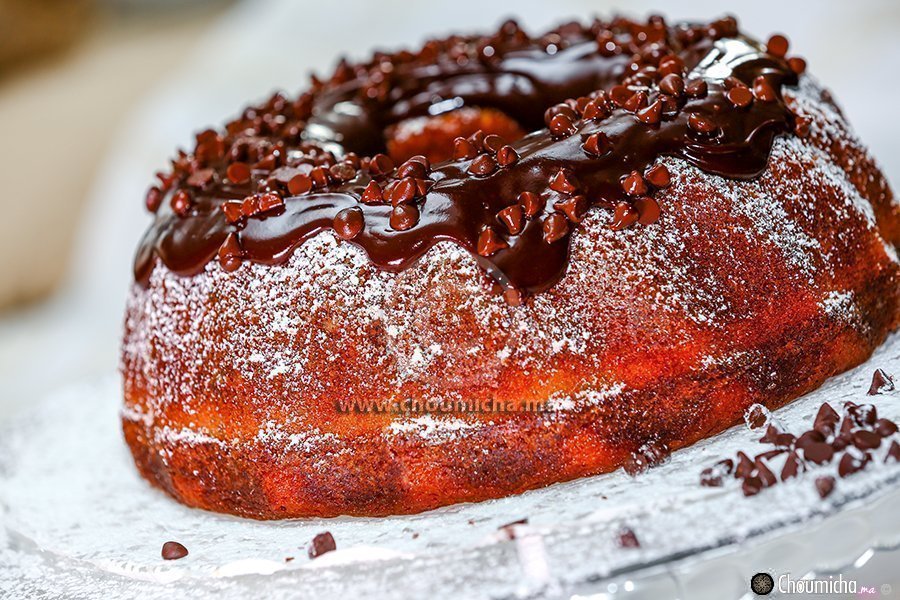 • يرش الكيك بالسكر الناعم، تسكب فوقه كاناش الشكلاطة ويزين بحبيبات الشكلاطة.