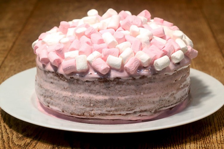 5. طريقة تقديم الكيك: في طبق التقديم: توضع عجينة البسكويت ومن فوقها كريما اللوز وحبّات الفراولة وكريما الماسكاربوني. وزيّني الكيك بقطع من المارشميلو.