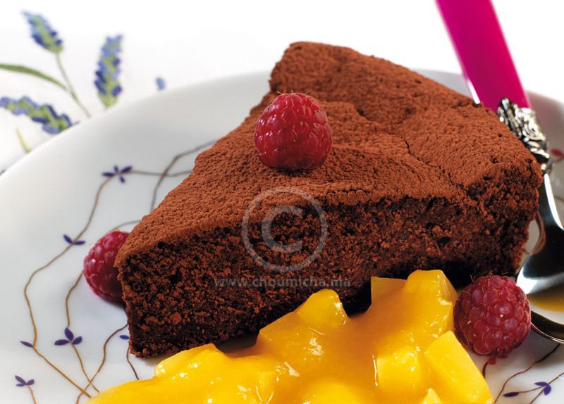 - تذاب الشكلاطة مع الزبدة في حمام مريم. يطرب أصفر البيض مع السكر حتي يصبح الخليط أبيضا وخفيفا. يضاف إليه الشكلاط المذاب و الدقيق والنشا المنخولين. يطرب أبيض البيض مع قبصة ملح بالطراب الكهربائي حتى يصبح مثل الثلج. يضاف أبيض البيض المطرب للعجين ويمزج الكل بملعقة خشبية.