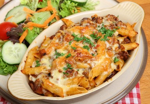 - أضيفي ثلث صلصة البشاميل إلى طبق الخَبز ثم أضيفي ثلث الباستا وفوقها جبنة الموزاريلا والبارميزان ثم ضعي طبقة من صلصة الراجو.