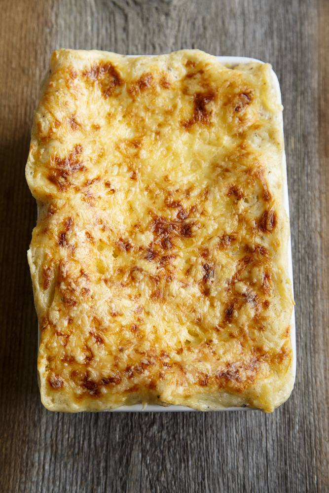 - كرري الخطوات السابقة حتى تنتهى المكونات ، وتكون آخر طبقة هي طبقة البشاميل، ودخليها فرن عالي لمدة 45 دقيقة حتى يصبح لونها ذهبي، وقدّميها.