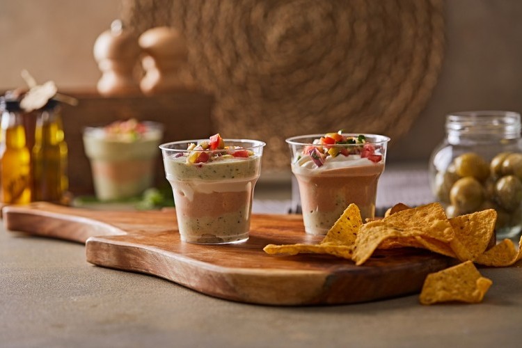 - طريقة التقديم: توزَّع كل طبقة من الطبقات الثلاث على أكواب التقديم الشفَّافة، التي تزيَّن بفرم البندورة والبصل والزيتون. تُقدَّم الأكواب، وإلى جانبها الـ”ناتشوز” أو الخبز العربي المحمَّص.
