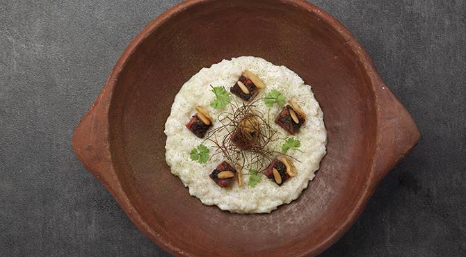لإنهاء الريزوتو، يضاف اللبن الزبادي والمستكة والبارميزان والزبدة. تحرك كل المكونات معاً حتى تصبح متجانسة وكريمية وتتبل بالملح والفلفل وتقدم فوراً.
