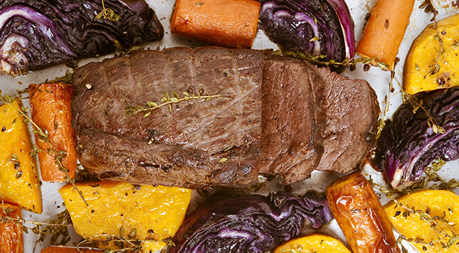 يُسخن الفرن إلى 430 فهرنهايت. يتبل اللحم البقري بالملح والفلفل ويوضع في منتصف قالب شواء مسطح بحيث يكون إتجاه الدهن إلى أعلى. يُقلب اليقطين والجزر والملفوف والزعتر والزيت معًا في وعاء كبير الحجم. يثتبل الخليط بالملح والفلفل. تُنثر الخضروات حول اللحم البقري.