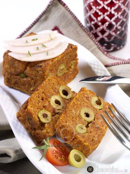 • في قالب مدهون بالزيت تفرغ نصف كمية الخليط، تغطى بطبقة من الزيتون الأخضر ثم يوضع فوقها ما تبقى من اللحم المفروم.
