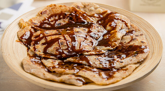 تخلط الطحينة بكمية مساوية من الدبس وتوزع فوق الاقراص ايضا (حسب الرغبة)