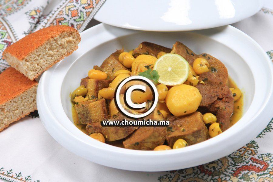 - تصفف قطع اللحم في طبق مسخن، تزين بالبطاطس والزيتون وتسقى بالمرق.