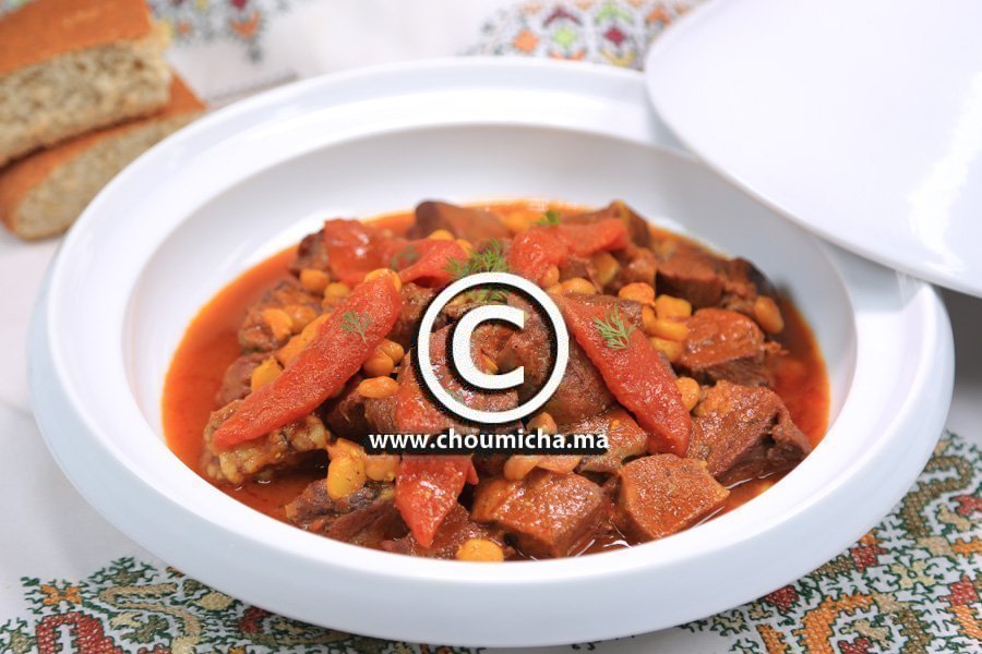 - في طنجرة، يوضع الحمص، قطع اللحم، باقة الأعشاب، الثوم، التوابل، الزيت، الطماطم ومركز الطماطم.