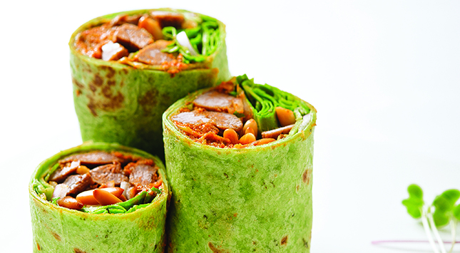 تُفرد تورتيلا السبانخ على سطح نظيف ويُفرد على كل منها بستو الطماطم المجففة، ثم تضاف شرائط اللحم وأوراق السبانخ الصغيرة وفصوص البصل الأحمر، ويضاف الملح والفلفل حسب الذوق، ثم يُرش الصنوبر.