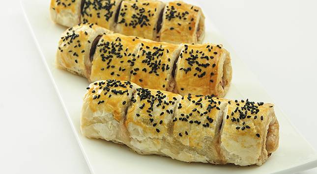 يُلف عجين الباف بيستري ويُغلق حول نقانق اللحم حتى تلتصق حواف الباف بيستري الطويلة. تُغلق الحواف معًا باستخدام قليل من الماء. تُقطع كل لفافة من النقانق بحجم 3 سم حتى تصبح لفائف النقانق بحجم اللقيمات.