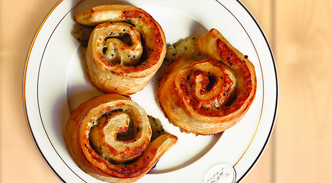 يفرد خليط الجبن على العجين ويلف العجين عليه.