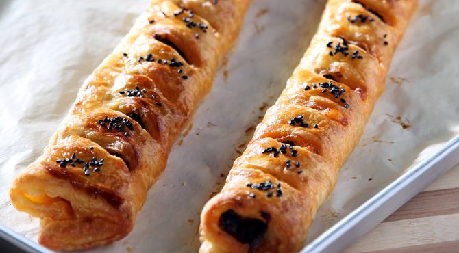 8. يُدهن وجه كل لفافة سجق بصفار البيض ويُرش ببذور حبة البركة السوداء.
