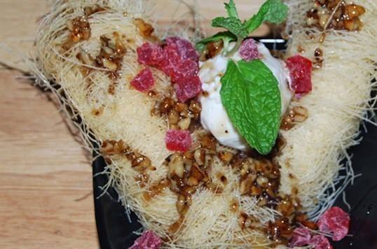- يصب الشربات على لفائف الكنافة بالموز وتزين بآيس كريم الفانيليا لتصبح جاهزة للتقديم.