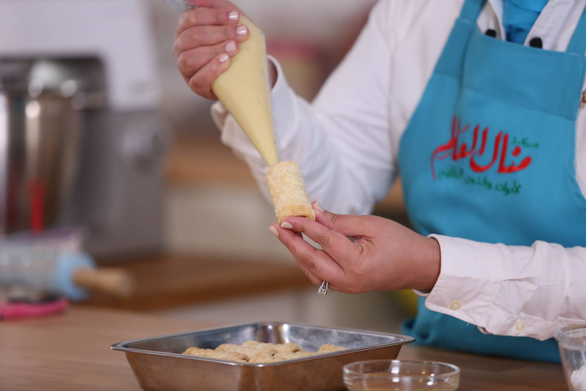 أحضري الأنابيب المعدنية الخاصة لتشكيل العجينة إلى لفائف.أحضري صينية قصيرة الحافة.