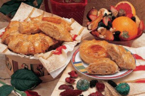 6. توضع لفائف مربى التين والكاجو على صينية فرن غير لاصقة و تُدهن اللفائف بزلال البيض و تخبز في فرن حرارته 220 درجة مئوية لمدة 20–25 دقيقة أو حتى يصبح لونها ذهبياً.