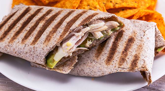 تلف التورتيا، ثم تشوى في شواية الشطائر حتى تصبح التورتيا ذهبية اللون وهشة.