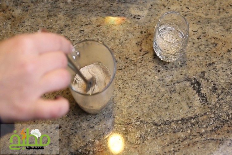 اخلطي الخميرة بنصف كوب من الماء الدافئ وملعقة السكر حركي الخميرة قليلاً واتركيها مغطاة حتى يتضاعف حجمها وتظهر الفقاقيع عليها