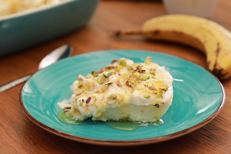 - اخلطي القشطة مع الموز وعصرة ليمون ووزعي المزيج فوق طبقة السميد وضعي البايركس في الثلاجة لمدة 3 ساعات على الأقل قبل التقديم.